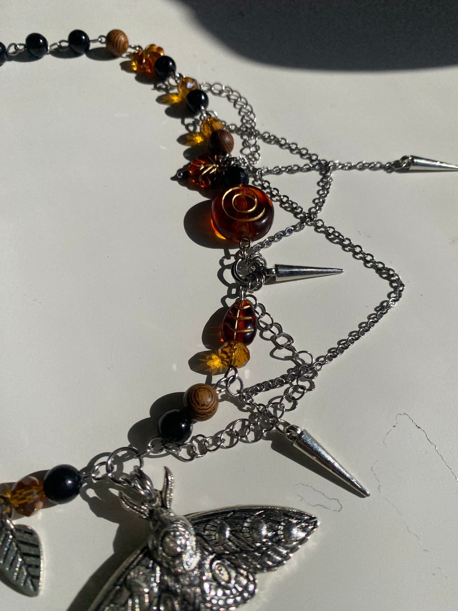 • Design: Asymmetrical layered chains with spiked drops and a central moth pendant.