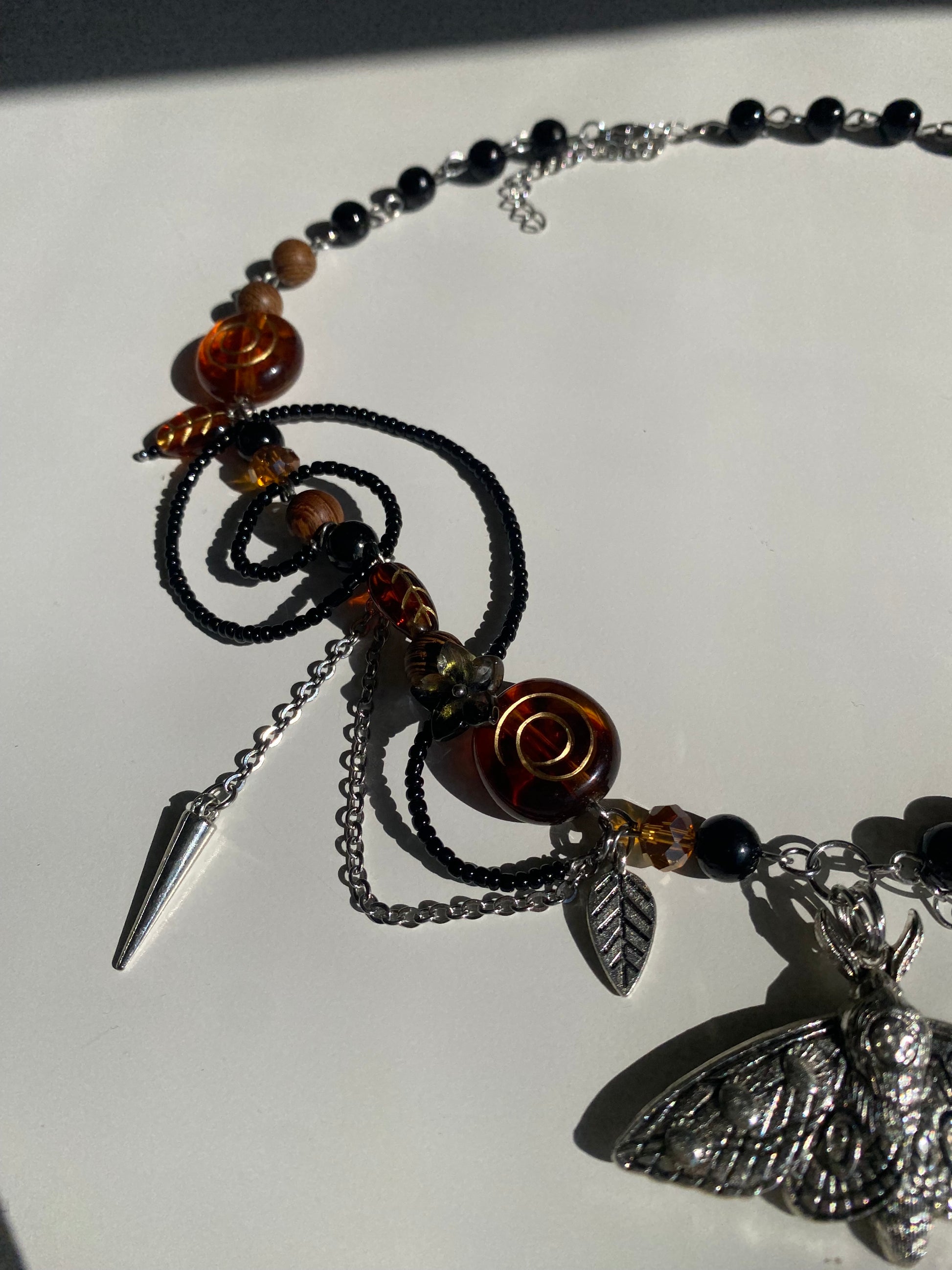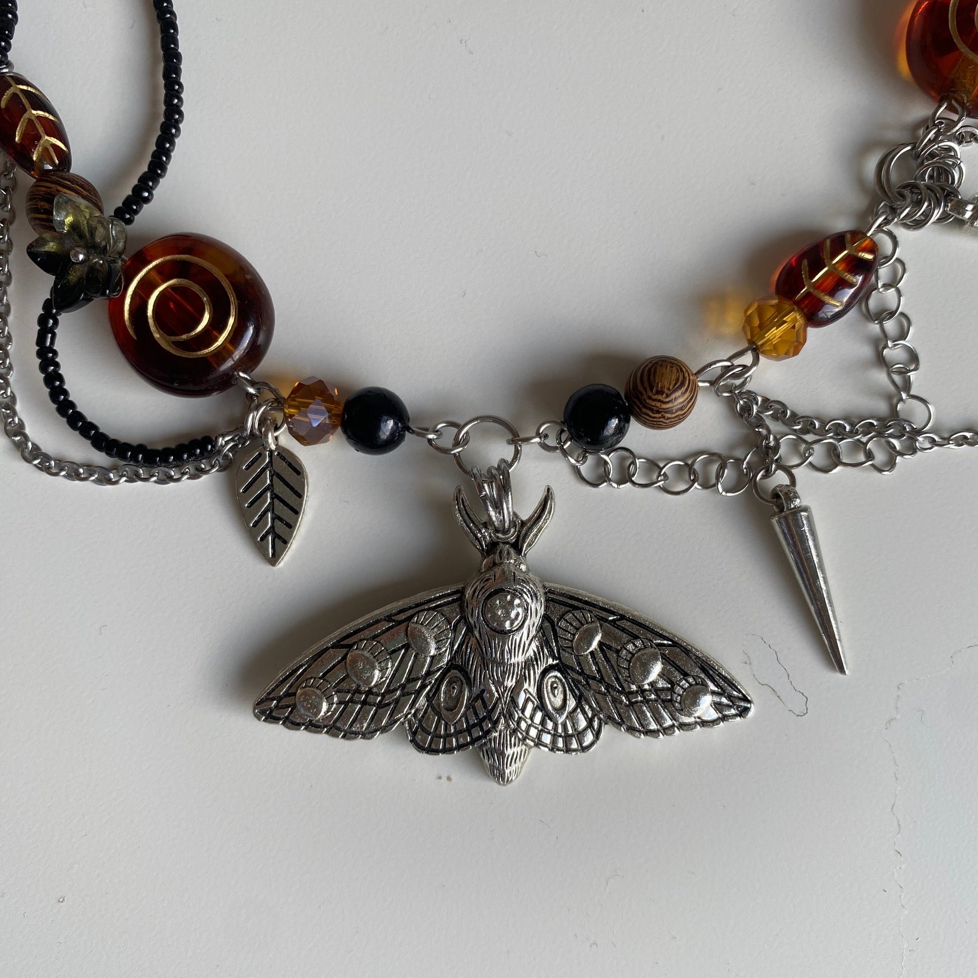 This handmade statement necklace is inspired by the Small Emperor Moth (Saturnia pavonia).